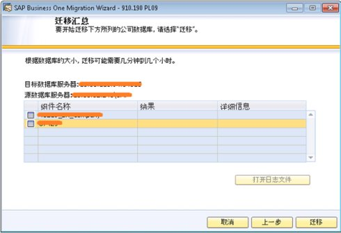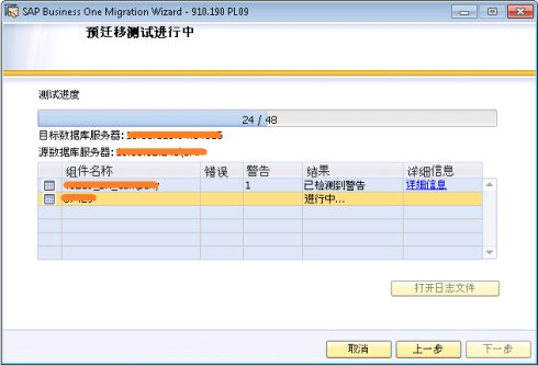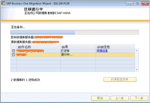 在遷移過程中,向?qū)冗M(jìn)行數(shù)據(jù)庫的備份,然后將公司數(shù)據(jù)庫復(fù)制到SAP HANA中。向?qū)б矔@示進(jìn)度條以及遷移結(jié)果。遷移完成后,點(diǎn)擊'打開日志文件',可以查看遷移的具體日志信息。點(diǎn)擊'下一步':