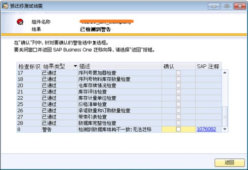 如果檢測到警告信息,則點(diǎn)擊'詳細(xì)信息'打開預(yù)遷移測試結(jié)果窗口,向?qū)谐鼍娴木唧w描述信息以及SAP注釋: