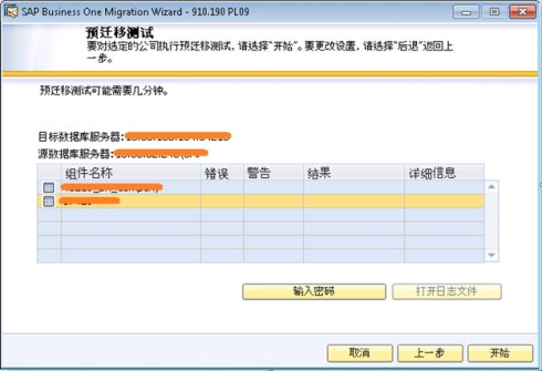 這里要開始進(jìn)行預(yù)遷移測試,對選定的公司數(shù)據(jù)庫進(jìn)行預(yù)測試。向?qū)z測所選公司數(shù)據(jù)庫是否能夠完成遷移,選擇'開始':