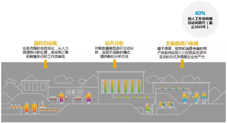 根據(jù)SAP公司及行業(yè)協(xié)會(huì)做的商業(yè)分析和預(yù)測,到2025年全球運(yùn)營的現(xiàn)代化商業(yè)中,將有60%的人工作業(yè)將被自動(dòng)化所取代,這些領(lǐng)域包括且不限于,制造業(yè),銀行業(yè),保險(xiǎn)業(yè),零售終端,倉儲(chǔ)配送等等。現(xiàn)代企業(yè)主要對(duì)業(yè)務(wù)流程自動(dòng)化,企業(yè)數(shù)據(jù)動(dòng)態(tài)分析,以及新的用戶體驗(yàn)有著極高的需求和期待。
