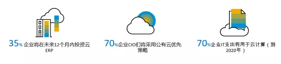 根據(jù)IDC咨詢公司2017年統(tǒng)計(jì),未來一年內(nèi)全球35%具有規(guī)模性的企業(yè)將開始投資云ERP,并且通過訪談和調(diào)研的形式得出結(jié)論,70%的企業(yè)CIO們會(huì)優(yōu)先考慮公有云解決方案作為IT戰(zhàn)略規(guī)劃。預(yù)測截至到2020年,全球企業(yè)用于云計(jì)算的支出將占到IT總支出的70%。