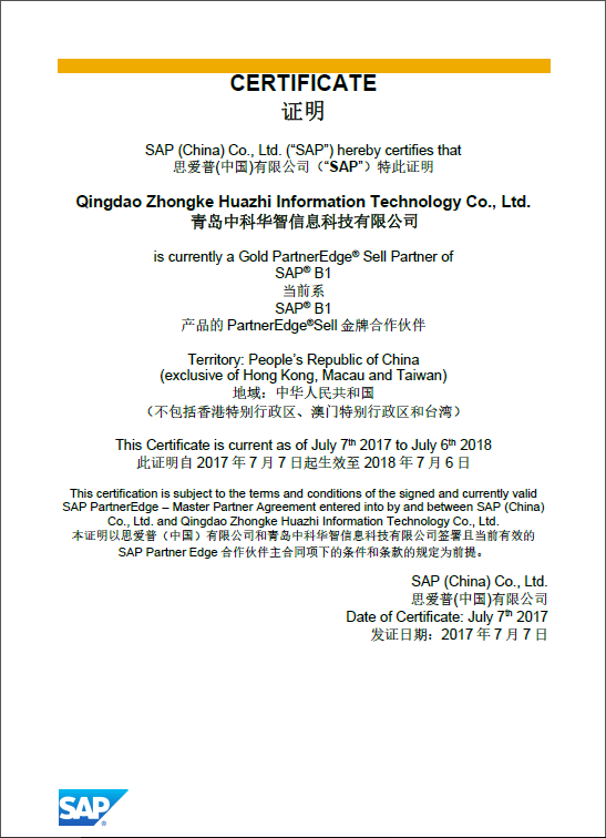2017年7月,全球知名的ERP軟件提供商德國(guó)SAP公司基于中科華智的技術(shù)實(shí)力、銷售業(yè)績(jī)、市場(chǎng)覆蓋范圍和客戶服務(wù)滿意度調(diào)查,通過嚴(yán)格的評(píng)測(cè)后,將青島中科華智信息科技有限公司升級(jí)為SAP B1金牌合作伙伴,這是對(duì)我們技術(shù)實(shí)力的認(rèn)可,是用戶對(duì)我們優(yōu)質(zhì)服務(wù)的贊譽(yù)。中科華智作為企業(yè)數(shù)字化服務(wù)整體解決方案服務(wù)商,將繼續(xù)用專業(yè)的技能為客戶提供優(yōu)質(zhì)的服務(wù)。
