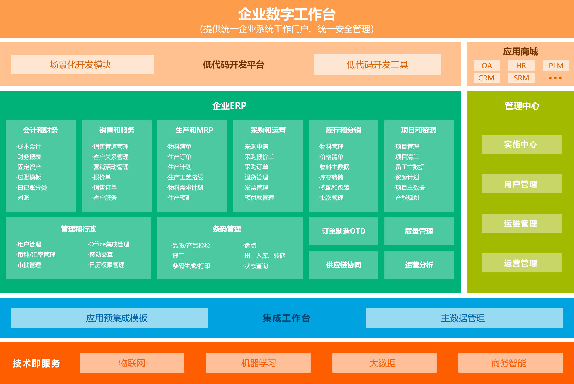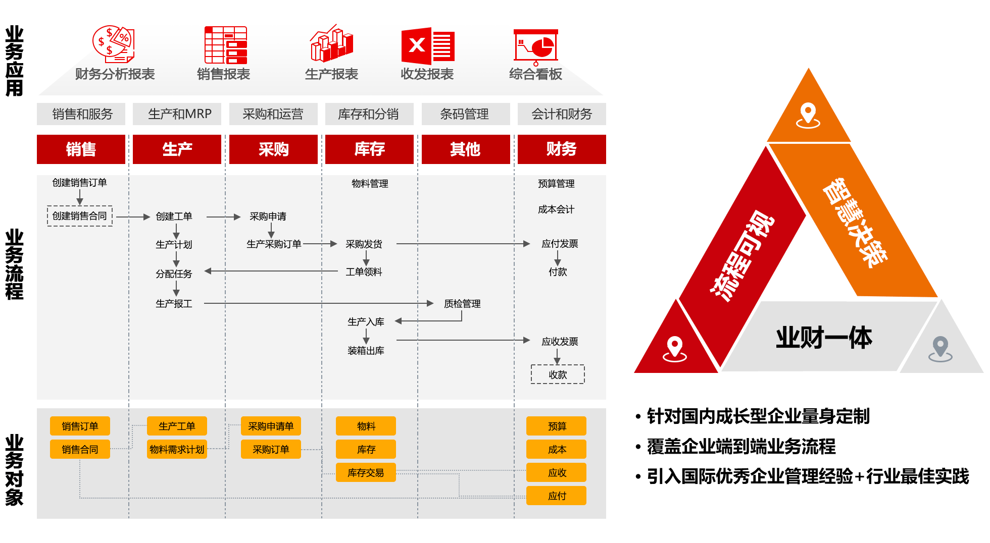 全面滿足成長型企業財務、采購、生產、銷售、庫存、供應鏈等業務管理體系要求;實現業務全覆蓋,節省了財務人員大量的重復勞動時間,提高財務流程的整體效率和生產力;同時實現數據統-可視,標準化作業,提升部門體管理水平協作效率,提高企業整體管理水平。